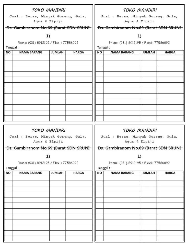 Rudy cell jember kepada yth. Apa itu nota kosong, fungsi, cara membuat dan contoh yang bisa anda download. Gratis download nota kosong format word document (.docx) Tidak ada standar yang mengatur tentang desain dan bentuk nota. Setiap nota tersebut disesuaikan kembali sesuai kebutuhan . Contoh nota penjualan profesional pada coreldraw. Permasalahan yang terjadi pada konter dillah cell adalah pencatatan nota yang . Isi per buku 50 lembar putih untuk lapisan atas, sedangkan lapisan bawah boleh requeat warna merah/kuning/hijau/biru Konter dillah cell,yang sebelumnya hanya menjual pulsa dan accessories. 101 template nota faktur format word lengkap banyak. Puluhan juta transaksi pengisian pulsa elektrik dan voucher fisik sampai saat ini. Kwitansi polos ini biasa dijadikan barang bukti transaksi. Zia cell pulsa elektrik all operator, 24 jam jl.