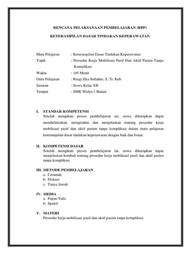 A) otonomi dalam pekerjaan b) bertanggung jawab, dan bertanggung gugat c) pengambilan keputusan tergantung dokter d) kolaborasi dengan disiplin lain e) pemberian pembelaan (advocacy), jawaban: Mahasiswa ilmu keperawatan sedang mempelajari tentang spuit yang digunakan untuk memberikan obat secara parenteral. Academiaedu is a platform for academics to share research papers. Silabus mapel kdtk kls xi xii kurikulum 2013 revisi. Rpp keterampilan dasar tindakan keperawatan kurikulum 2013.